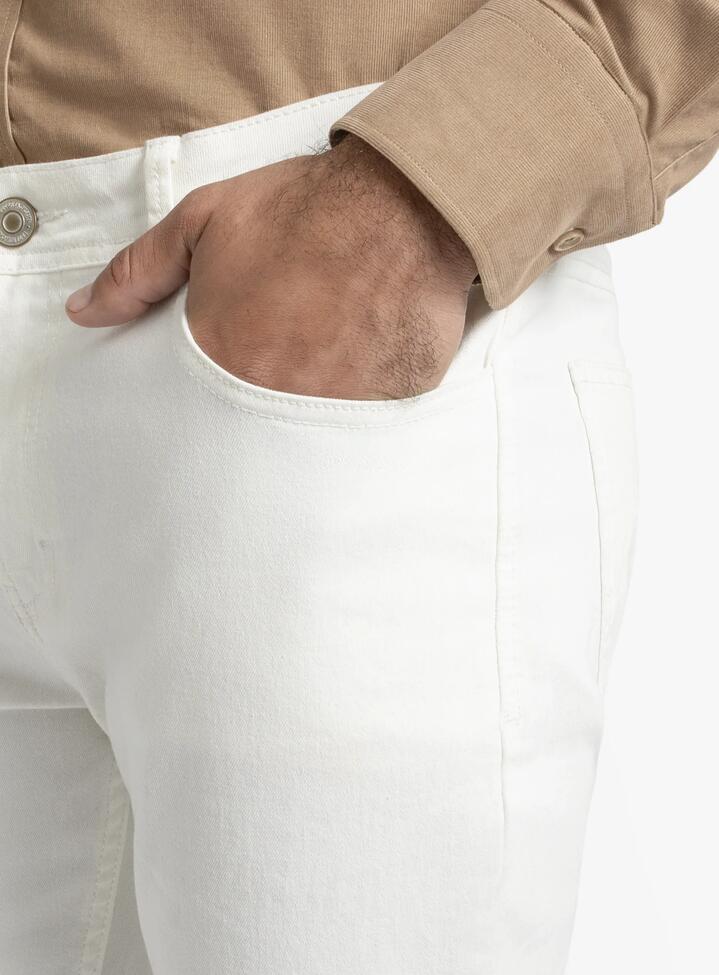 A fresh take on a wardrobe essential, our Off-White – Ecru Denim Jeans offer a clean, modern silhouette in a versatile off-white tone. Crafted from a comfortable stretch denim, they feature a mid-rise waist and a straight-taper leg—cut for ease through the thigh with a refined taper below the knee. The soft ecru wash adds a contemporary edge while remaining easy to style year-round. Stylist Notes For a refined smart-casual look, pair these ecru jeans with a crisp white shirt or navy knit polo and leather loafers. Layer with neutral tones—like an oatmeal sweater or beige overshirt—for an effortless weekend style. For evening, go modern with a black tee and jacket, finished with Chelsea boots. In warmer months, roll the hem and add a breezy linen shirt in soft tones, while in winter, contrast with darker knits and a tailored coat for a sharp, season-ready outfit. *Coordinating Jacket available