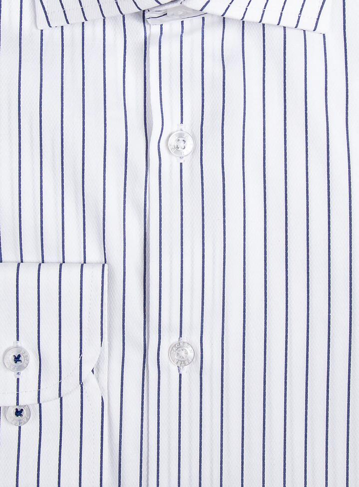 A crowd favourite for dressing up casual and corporate suiting, the navy Pinstripe business shirt. Its elegantly simple pattern and contrast palette makes for easy pairing with tailored suits and separates. Woven from fine strands of Egyptian cotton, this bold but breathable weave is an excellent alternative to oxford or poplin patterned shirts. Complement with Polka Dot or patterned silk ties, or dress down with a loose collar and navy blazer.